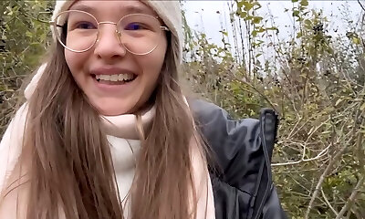 Pale big-boobed ash-blonde pisses and then sucks a dick on the river bank