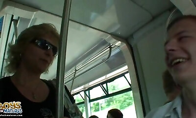 Plump mature woman swallows two cocks at once
