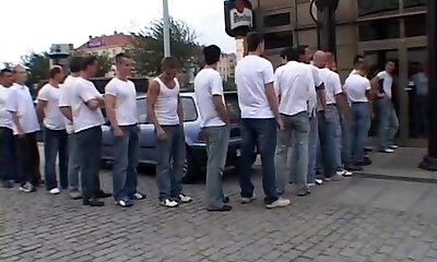 Slutty brunette fucked hard by 30 studs in this gangbang film